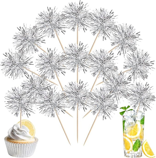 40 PCS Foil Firework Cupcake Toppers Fireworks Cupcake Picks Sparkle Tinsel Cake Decorations Cocktail Fruit Toothpick for Firework Theme Birthday Wedding Graduation Party Decorations Supplies Silver