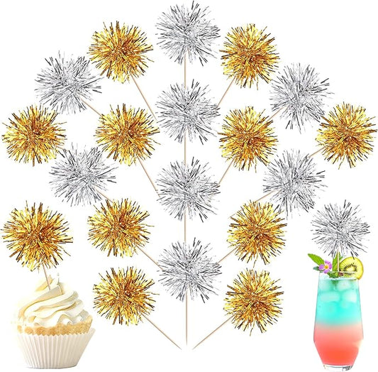 40 PCS Foil Firework Cupcake Toppers Sparkle Tinsel Cupcakae Picks Foil Firework Party Decorations Cocktail Fruit Toothpick for Fireworks Theme Birthday Wedding Graduation Party Decoration Gold Silver