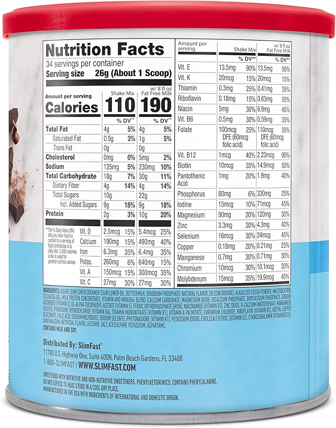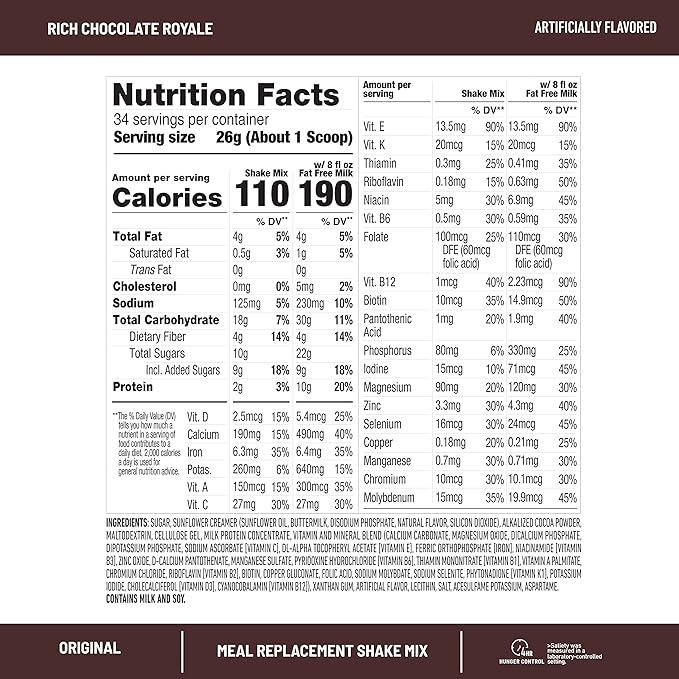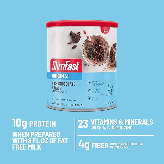 - MEAL REPLACEMENT SHAKE: SlimFast Meal Replacement Shakes are the perfect diet friendly shake mix. Each serving is packed with 10g of Protein when combined with 8 oz of Fat Free Milk to keep you full for hours with a decadent and rich chocolate royale flavor to satisfy your sugar cravings.
