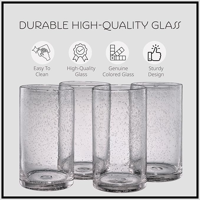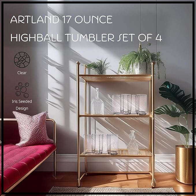 Artland 17oz Highball Tumbler, Set of 4 | Iris Seeded Design, Clear | Drinking Glass for Parties and Everyday Use - Mojito, Whiskey, Cocktail | Glassware & Kitchenware Essentials