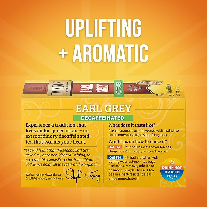- CLASSIC BLACK TEA: Fresh, fragrant and flavoured with distinctive notes of citrus and bergamot, this Earl Grey tea has all the taste of the original; Decaffeinated, 20 Count, Pack of 6