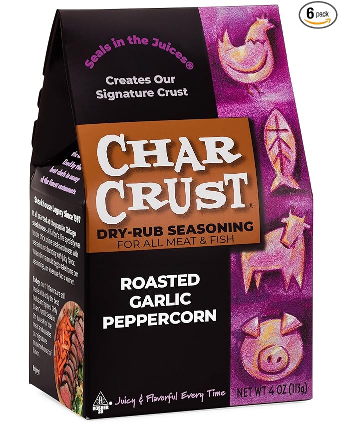 Char Crust Dry-Rub Seasonings Roasted Garlic Peppercorn | All-in-one seasonings | Perfect for Steak, Burgers, Chicken, Salmon | Signature Crust that Seals in the Juices, 4 Ounce (Pack of 6)