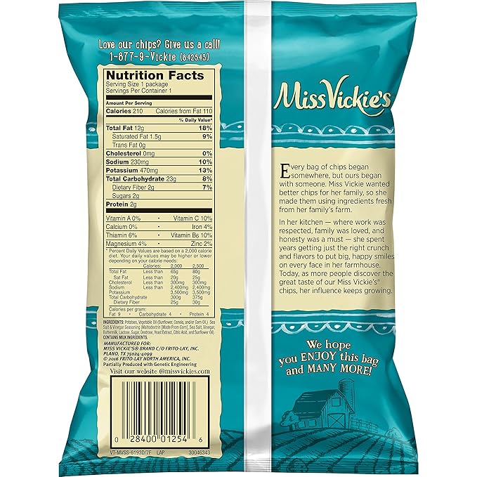 - Includes 64 count of 1.375 ounce bags of Miss Vickie's Sea Salt & Vinegar Flavored Kettle Cooked Potato Chips