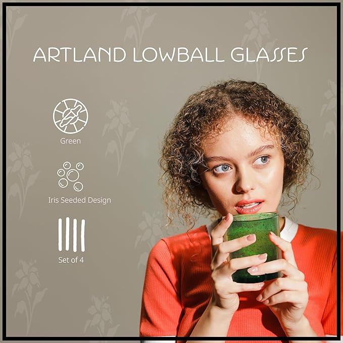 Artland 14oz Double Old Fashion Glass, Set of 4 | Iris Seeded Design, Green | Drinking Glass for Parties and Everyday Use - Mojito, Whiskey, Cocktail | Glassware & Barware Essentials