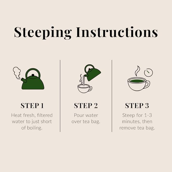- Steeping Instructions Steeping green tea is easy. Simply heat fresh, filtered water just short of boiling. Then pour 6 oz of water over tea and steep for 1-3 minutes (if using a tea bag) or 2-4 minutes (if using full-leaf tea.)