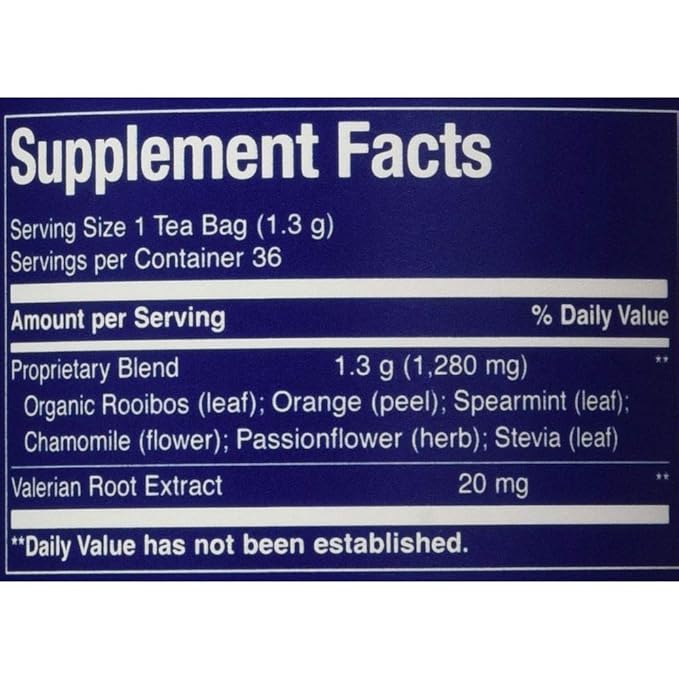 - Ingredients: Organic Rooibos (leaf), Orange (peel), Spearmint (leaf), Chamomile (flower), Passionflower (herb), Stevia (leaf), Valerian Root Extract.