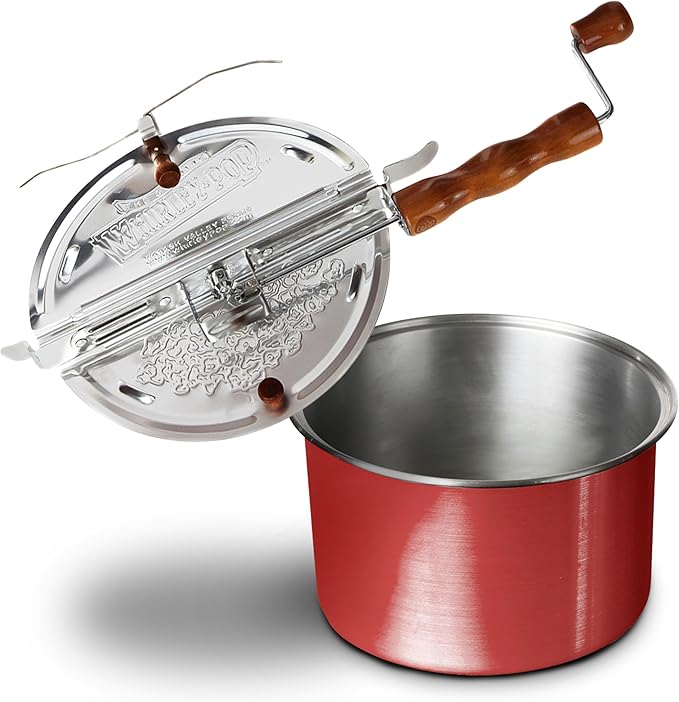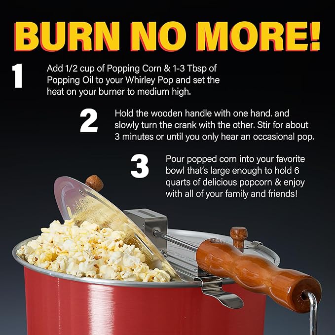 - Perfect Movie Popcorn - The Original Whirley Pop Popcorn Popper takes the guesswork out of creating delicious, perfectly cooked popcorn. Spin the handle to make up to 6 quarts of flawless popcorn.