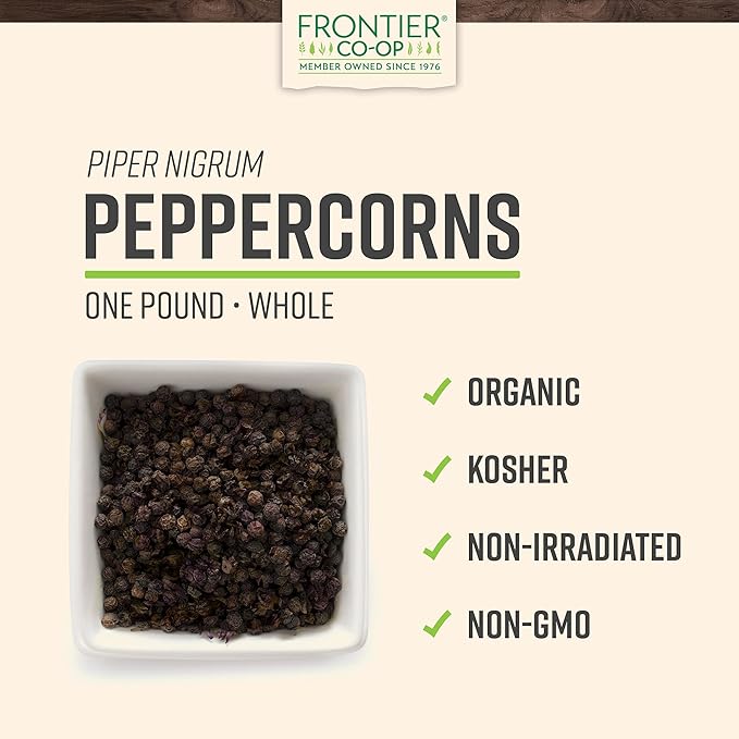 Frontier Co-op Black Peppercorns Whole, 1lb Bulk Bag - Tellicherry Black Pepper - Organic Peppercorns for Grinder Refill, Cooking, Pickling and More