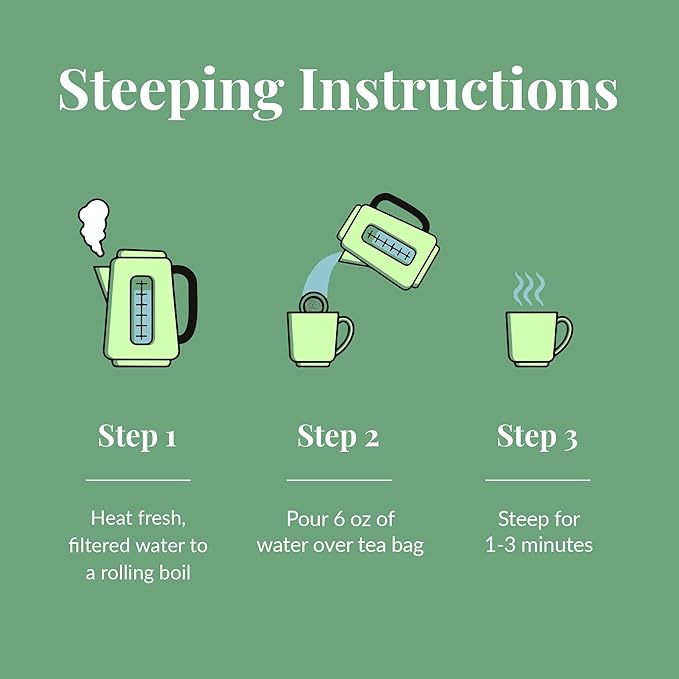 - STEEPING INSTRUCTIONS: Simply heat fresh, filtered water to just short of boiling. Then pour 6 oz water over tea and steep for 1-3 minutes.