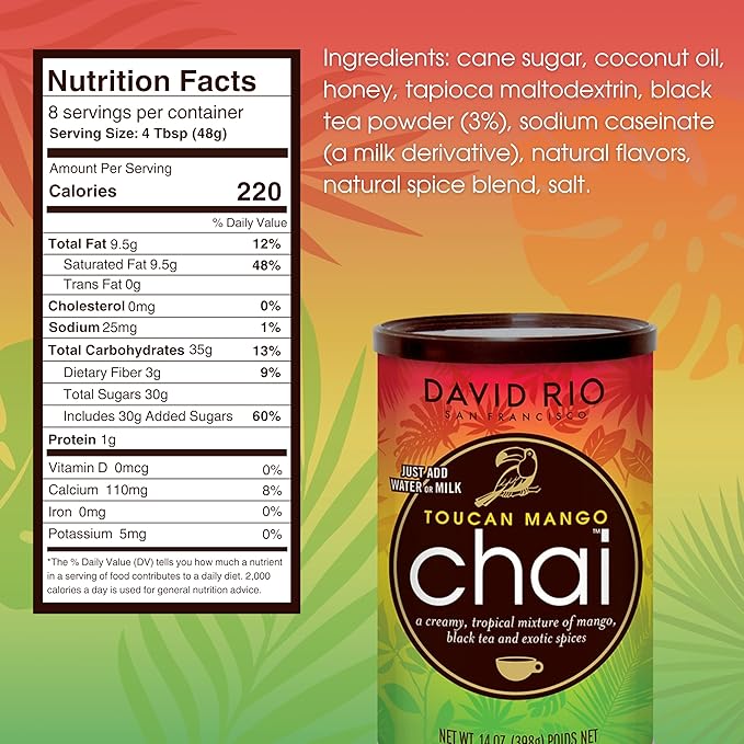 Toucan Mango Chai Tea Latte Mix, 14 Oz, Black Tea, Organic Spices, Dairy Free, Serve Hot or Cold, Just Add Water or Milk, 8 Servings