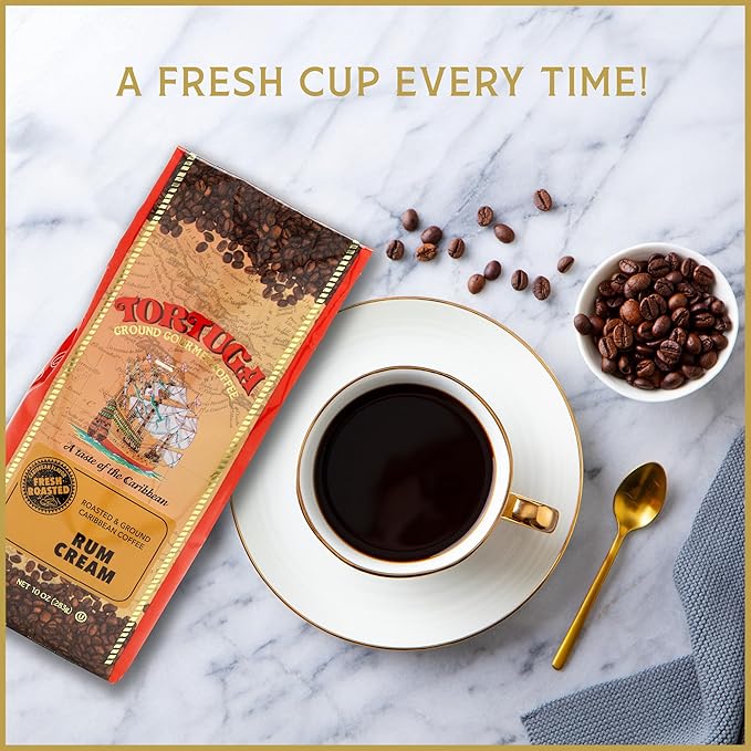 - RUM CREAM BLEND COFFEE: Tortuga's ground coffee adds the flavor of the Caribbean in a cup. A rich roast coffee flavored with 100% Arabica beans that will bring a bold, delicious flavor that is incredible enjoyable. Ready to go for the simple convenience of pre-ground coffee.