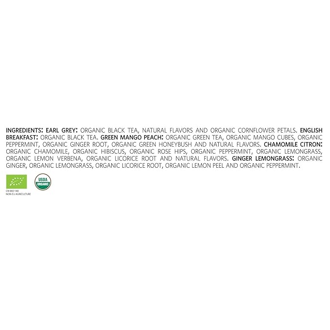 - ORGANIC TEA SAMPLER with an assortment of our most popular USDA Organic tea blends - Earl Grey, English Breakfast, Chamomile Citron, Green Mango Peach & Ginger Lemongrass.