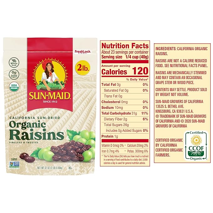 - ORGANIC CALIFORNIA SUN-DRIED RAISINS: Sun-dried organic California raisins made from dried grapes exclusively grown by certified organic growers