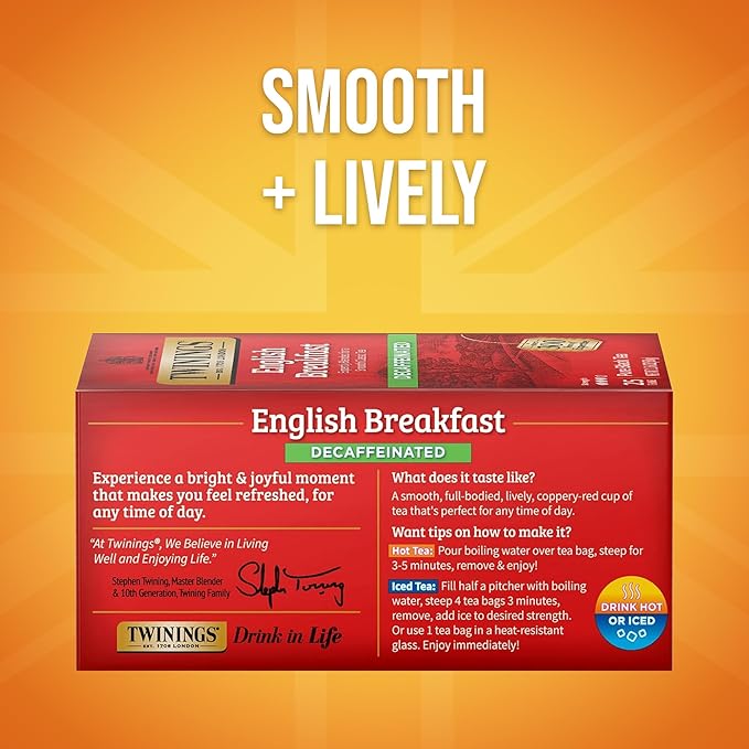 - DECAF ENGLISH BREAKFAST TEA: We select the finest teas, each with their own unique characteristics; Our most popular tea without the caffeine, making it a special treat any time of day; Decaffeinated, 25 Count, Pack of 6