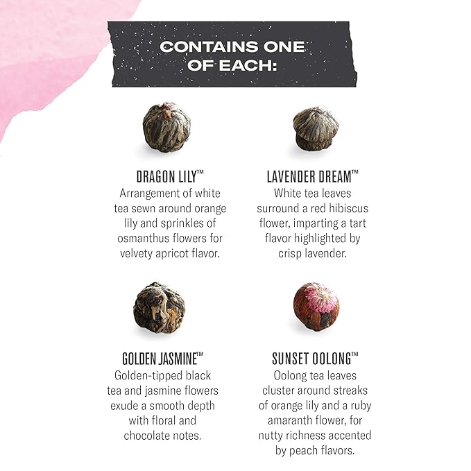 - Beautiful Blossoms of Tea: When steeped in hot water, these rare Leaves of Art slowly blossom into a bouquet of breathtaking shapes and exquisite flavors