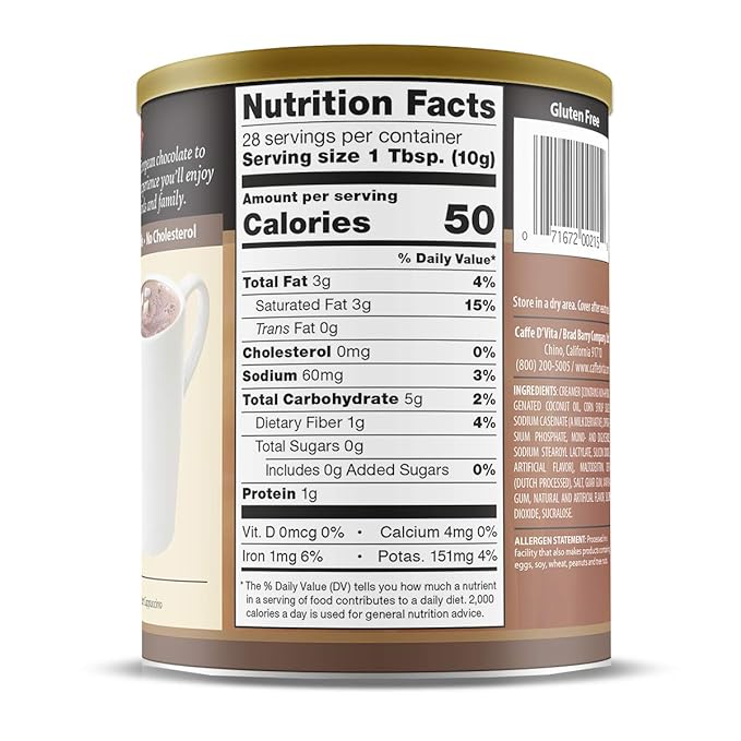 Caffe D'Vita Sugar Free Hot Cocoa Mix - Sugar Free Hot Chocolate Mix, Gluten Free, Low Fat, No Cholesterol, No Hydrogenated Oils, No Trans Fat, Kosher, Hot Cocoa Mix Bulk - 10 Oz Can