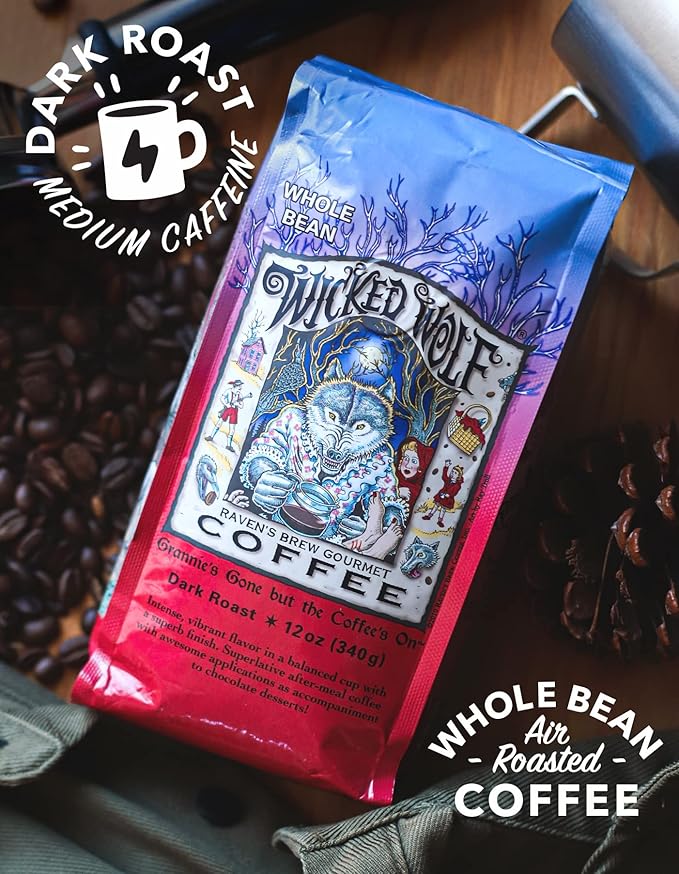- Wicked Wolf Dark Roast Coffee – Granny's Gone But The Coffee's On—Intense, vibrant flavor from a blend of highly select and exotic origins. Superlative after-meal coffee with awesome applications as accompaniment to chocolate desserts. Amazing no matter how it’s brewed: drip, press, cold brew and more! Full body of currant and spice with a mild sweetness in a balanced cup with a superb finish, this silky-smooth blend is especially good as cold brew.