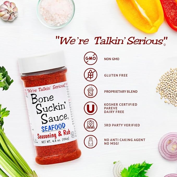 Bone Suckin' Seafood Seasoning & Rub, 4.8 Oz - For Frying, Grilling & Baking, Gluten-Free, Non-GMO, Kosher, Great on Shrimp, Salmon, Tuna, Tilapia, Pollock, Cod, Catfish, Clams, Crabs & More! Sugar Free & No Msg
