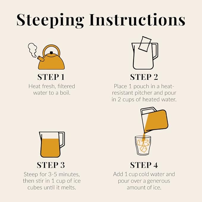 - STEEPING INSTRUCTIONS: Place one pouch with 2 cups of filtered, boiling water in a heat-safe pitcher. Steep for 3-5 minutes. Remove pouch then stir in one cup of ice until ice melts, then add one cup of cold water. Serve over more ice.