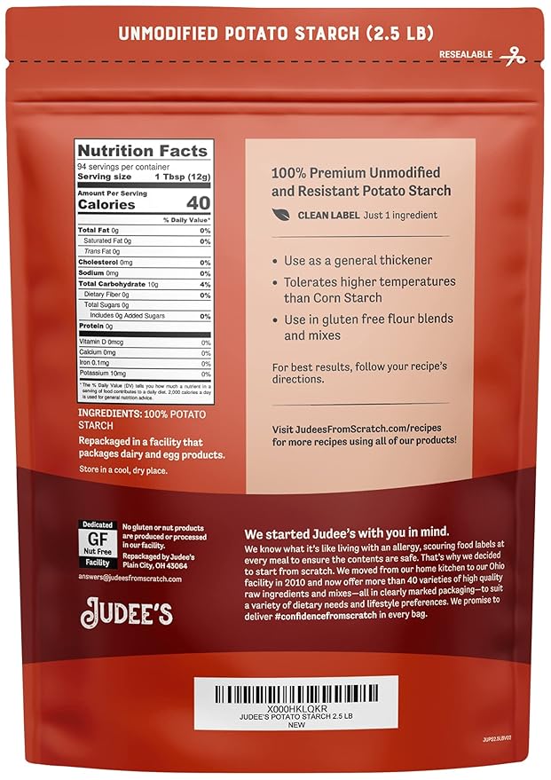 - Dedicated Gluten Free Facility: Produced in a dedicated gluten-free facility, Judee's Potato Starch offers a worry-free baking experience for those with dietary restrictions. Enjoy the confidence of using a product committed to safety and quality in every batch