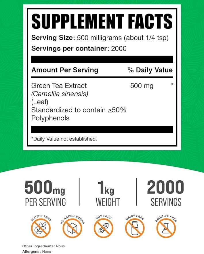 BulkSupplements.com Green Tea Extract Powder - 50% Polyphenol, Green Tea Supplement, Herbal Supplement - Gluten Free, 500mg per Serving, 1kg (2.2 lbs) (Pack of 1)