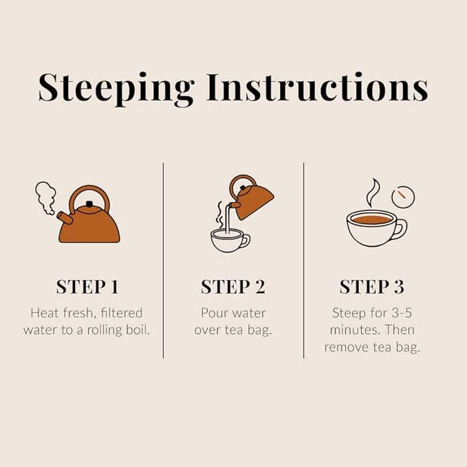 - Steeping Instructions: Steeping black tea is easy. Simply heat fresh, filtered water to a rolling boil. Then pour 6 oz water over tea and steep for 3-5 minutes.