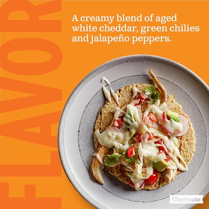 - Chef-mate ¡Que Bueno! White Queso Sauce is a creamy blend of aged white cheddar, green chilies and jalapeño peppers