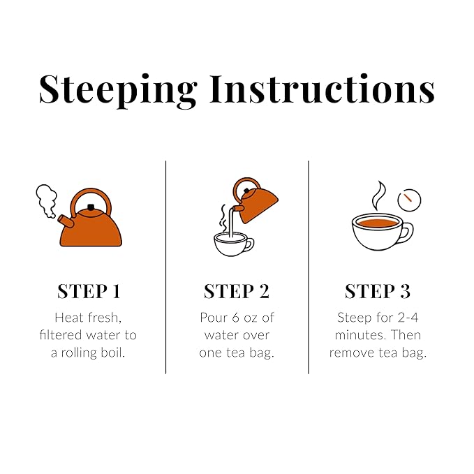 - Steeping Instructions: Simply heat fresh, filtered water to a rolling boil. Then pour 6 oz of water over a tea bag and steep for 2-4 minutes. Experiment to find your favored steeping time. Remove the tea bag and enjoy. After steeping, add the used tea bags to compost or soil — they make gardens happy.