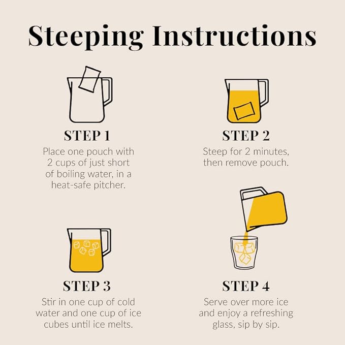 - STEEPING INSTRUCTIONS: Place one pouch with 2 cups of just short of boiling water in a heat-safe pitcher. Steep for 2–3 minutes. Remove pouch, then stir in one heaping cup of ice until ice melts. Add one more cup of cold water and serve over more ice. After steeping, add the used pouches to compost or soil — they make gardens happy.