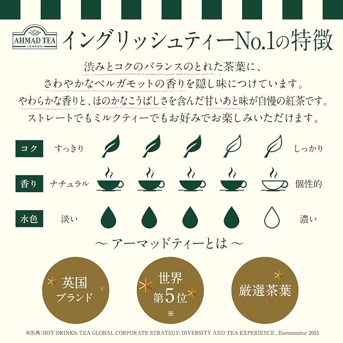 - DELICIOUS & SATISFYING FLAVOR – Ahmad Tea earned 22 Great Taste Awards, English No. 1 being one of our best-selling black teas. Fresh & elegant black tea with a subtle hint of bergamot.