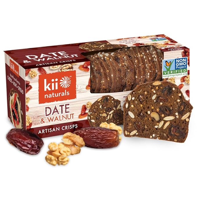 Kii Naturals Artisan Crisps, Healthy Snack Crackers for Cheese, Meats, Spreads, Charcuterie Board - Non-GMO, Kosher, No Preservatives, Hand-Crafted - Date & Walnut, 5.3 Ounce (Pack of 1)