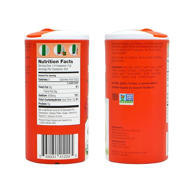 A. Vogel Herbamare Seasoned Spicy Sea Salt - USDA Organic - Seasoning Salt Infused w/ 12 Herbs - 33% Less Sodium - Non-GMO -Gluten Free - Kosher - 8.8 oz