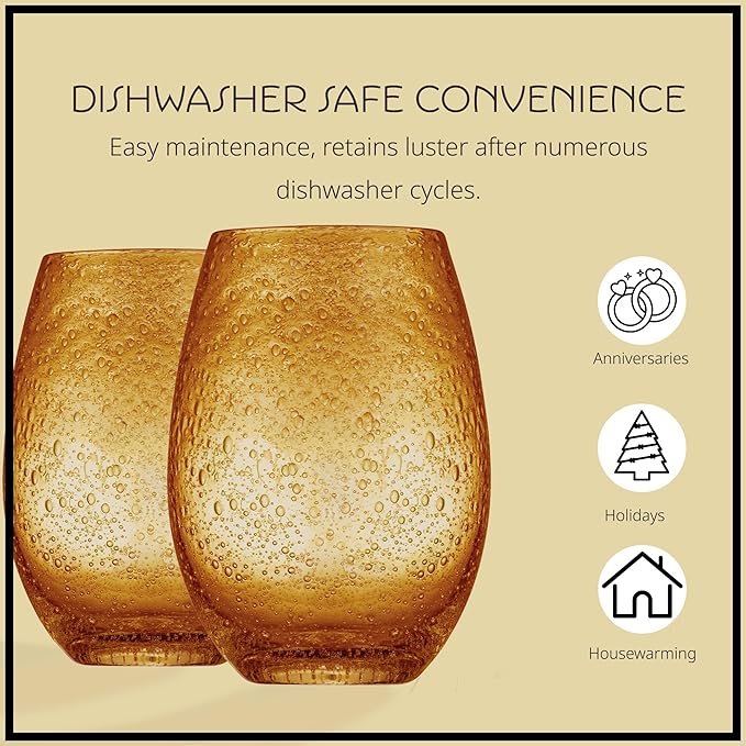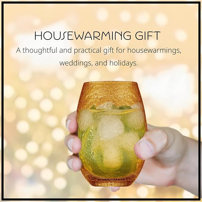 Artland Stemless Wine Glass, Set of 4 | Iris Seeded Design, Amber | Drinking Glass for Parties and Everyday Use - Wine, Champagne, Cocktail | Glassware & Barware Essentials