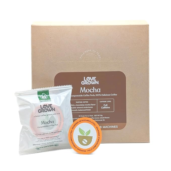 Love Grown Compostable Coffee Pods - Compatible with Single-Serve Brewing Machines - 100% Arabica Beans, Plastic-Free, Gluten-Free, Non-GMO - Mocha, Box of 15