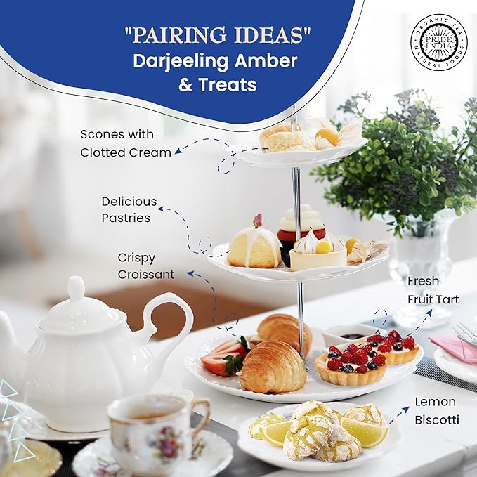 - Hearty Pairings: Darjeeling Amber’s delicate, floral flavor pairs beautifully with a variety of light, savory and sweet treats. Enjoy it with fresh scones, pastries, mild cheeses, or delicate finger sandwiches for a classic afternoon tea break.