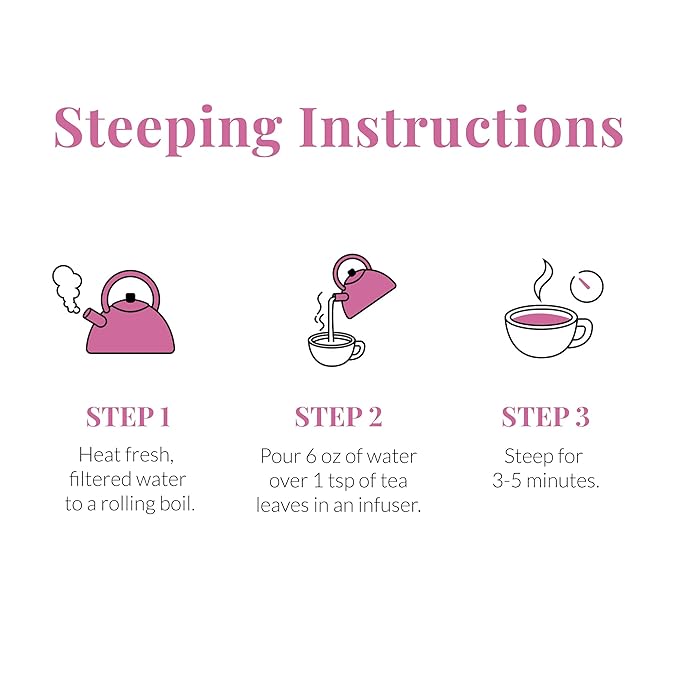 - STEEPING INSTRUCTIONS: Simply heat fresh, filtered water to a rolling boil, then pour 6 oz of water over 1 tsp of tea in an infuser and steep for 3-5 minutes.