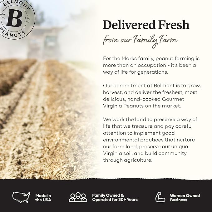 - Small Batch Gourmet Roasted Peanuts – Our commitment at Belmont is to grow, harvest, and deliver the freshest, most delicious, hand seasoned Virginia peanut on the market, with just the right amount of crunch and seasoning.