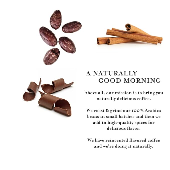 - Naturally Flavored – Our coffee starts with premium coffee and then we add in natural flavors & spices (cinnamon & cacao). You can expect a bold, yet extremely smooth coffee with a delicious aroma & taste of real spices. Absolutely no artificial flavors, preservatives, additives or colors are used.