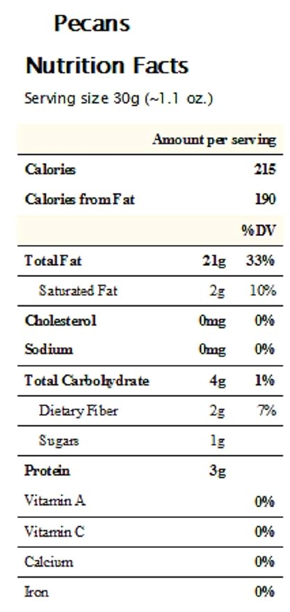 - Your Daily Pick Me Up: Need a healthy snack for the road, at work or for your little ones at school? Farm Fresh Nuts Raw Chopped Georgia Pecan Nuts are a healthy choice as they are rich in energy, antioxidants, vitamin E, calcium, magnesium, potassium, zinc and fiber. Whew! Talk about a handful of sunshine.