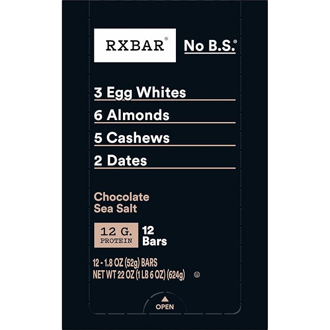 - Includes one, 22oz box containing 12 RXBAR Chocolate Sea Salt protein bars