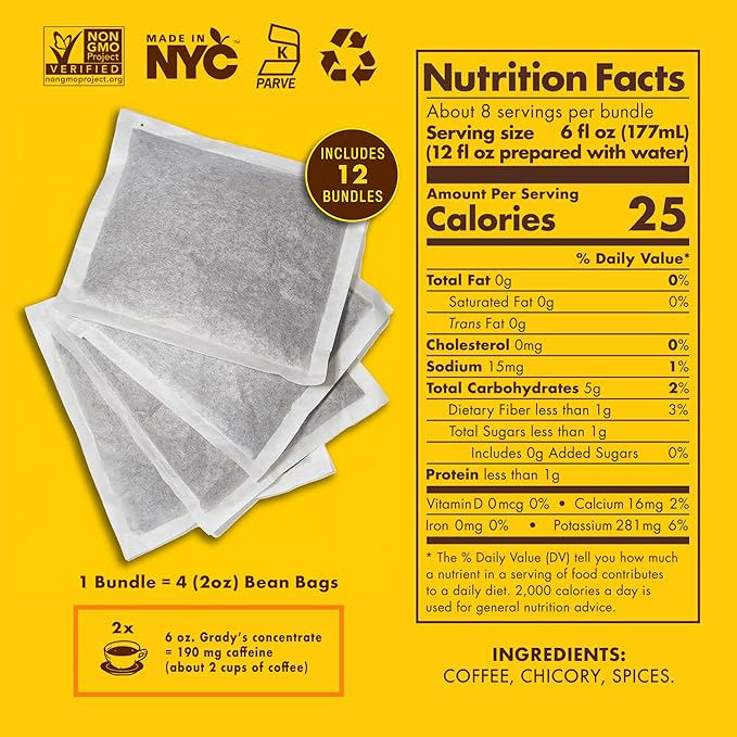 GRADY’S COLD BREW, New Orleans Style, 100% Arabica Ground Coffee & Chicory Pouches, 12 Bundles of 4 Easy-to-Brew Bean Bags, Makes 144 drinks