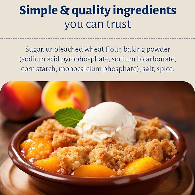 - Authentic Taste with Homestyle Ingredients Made with quality, recognizable ingredients including unbleached wheat flour, sugar, baking powder, and a touch of spice, this mix captures the essence of traditional peach cobbler. It’s a delicious, no-fuss dessert that tastes like it came from Grandma’s kitchen.