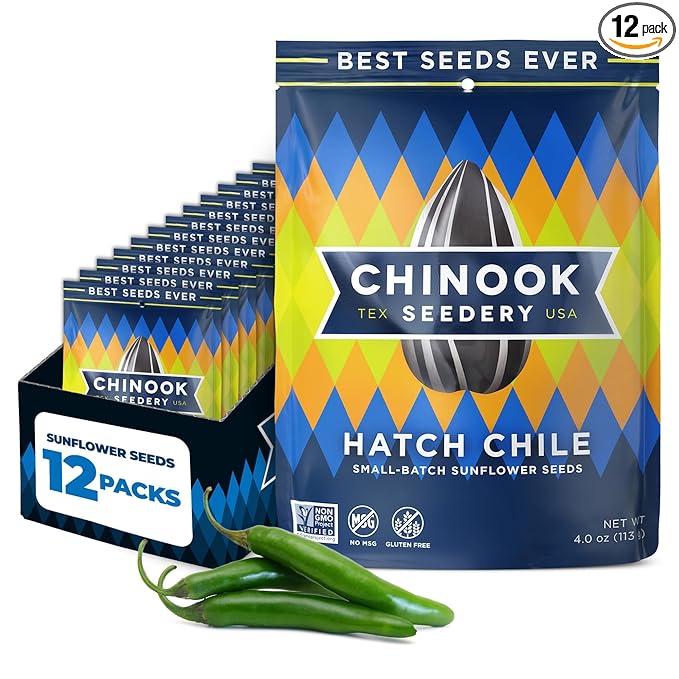 Chinook Seedery Roasted Jumbo Sunflower Seeds - Keto Snacks, Gluten-Free, Non-GMO, Hatch Chile Flavor 4 oz (12-Pack)