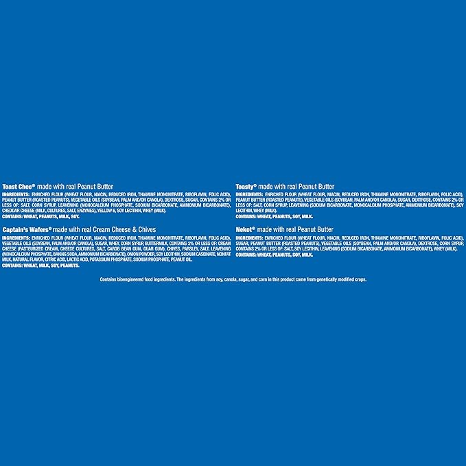 - Favorite flavors: featuring ToastChee peanut butter, toasty peanut butter, captain's wafers cream cheese and chives, nekot peanut butter cookies
