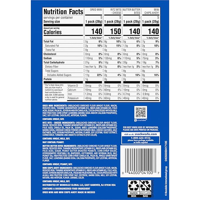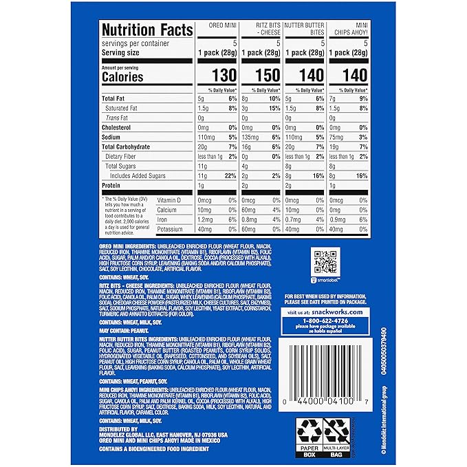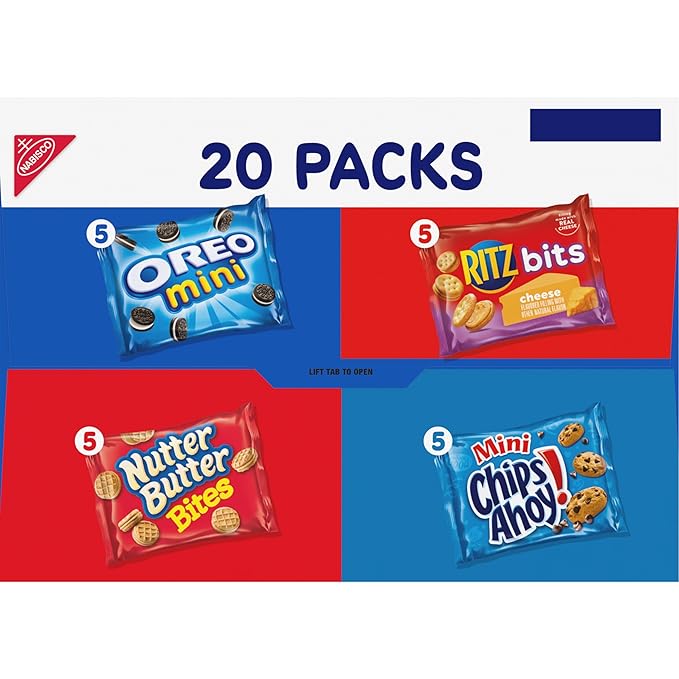 - One Nabisco Classic Mix Variety Pack with 20 snack packs, including OREO Mini, CHIPS AHOY! Mini, Nutter Butter Bites, RITZ Bits Cheese (packaging may vary)