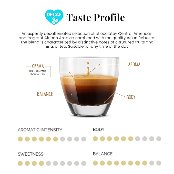 - Distinctive Aroma & Tasting Notes – With an intensity of 5/10, each decaf espresso pod releases a harmonious blend of citrus, red fruits, tea, and walnut, complemented by hints of milk chocolate and cereals. This unique mix brings a vibrant and satisfying espresso flavor to your coffee cup.