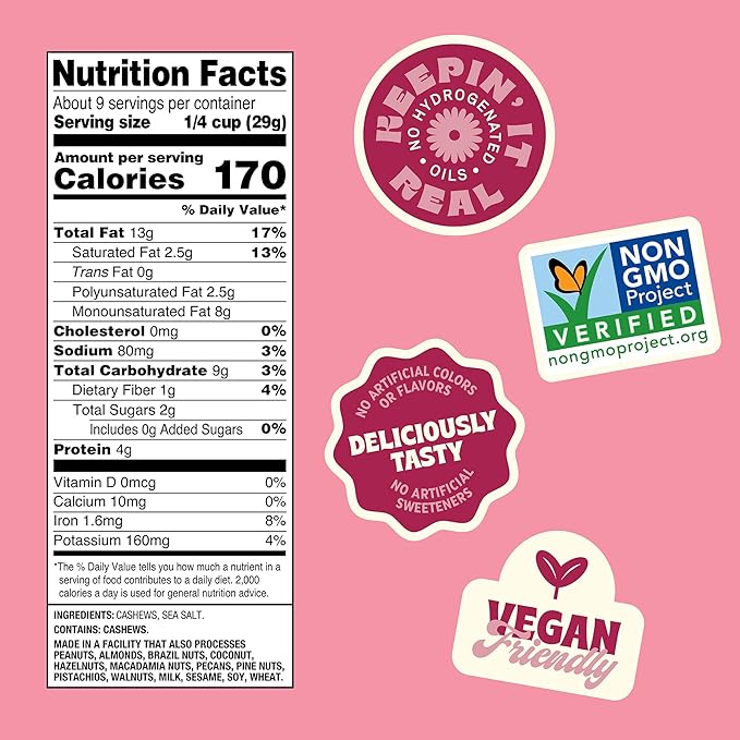 - SIMPLE & DELICIOUS CASHEWS: We take a naturally delicious cashew and dry roast it with sea salt; avoiding all the processed extras like hydrogenated oils and high-fructose corn syrup. Enjoy this good source of protein snack on the go, or at home with the people you love.