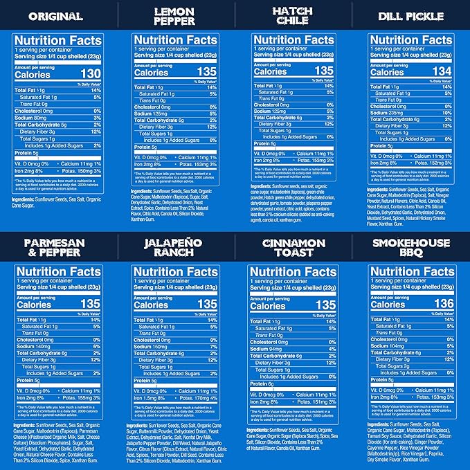 - LOW SALT SUNFLOWER SEEDS VARIETY PACK - NOW WITH 8 FLAVORS: Fuel up the entire team or hit the road with our upgraded 36-count variety pack, designed for sharing and savoring! Enjoy an expanded selection of 8 delectable flavors: (6) Original, (6) Parmesan & Pepper, (4) Jalapeno Ranch, (4) Lemon Pepper, (4) Smokehouse BBQ, (4) Hatch Chile, (4) Dill Pickle, and (4) Cinnamon Toast. Experience a taste sensation like never before while you bond over our irresistible sunflower seeds!
