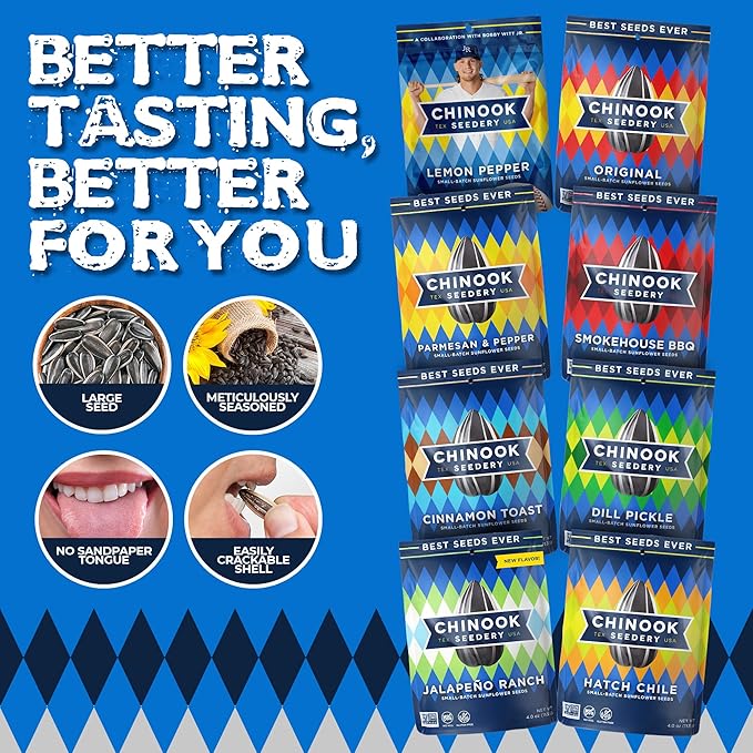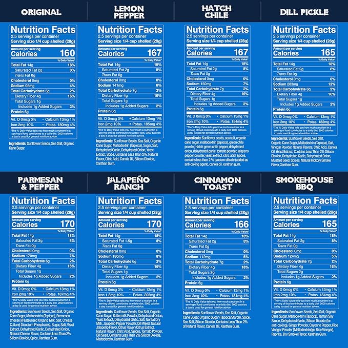 - LOW SALT SUNFLOWER SEEDS VARIETY PACK - NOW WITH 8 FLAVORS: Looking for seeds to fuel the whole team? Planning a getaway? Our convenient individual cases now offer even more to enjoy and share! Introducing our expanded selection of 8 mouthwatering flavors: (2) Original, (2) Parmesan & Pepper, (2) Jalapeno Ranch, (2) Lemon Pepper, (1) Smokehouse BBQ, (1) Hatch Chile, (1) Dill Pickle, and (1) Cinnamon Toast. Get ready for a taste adventure!