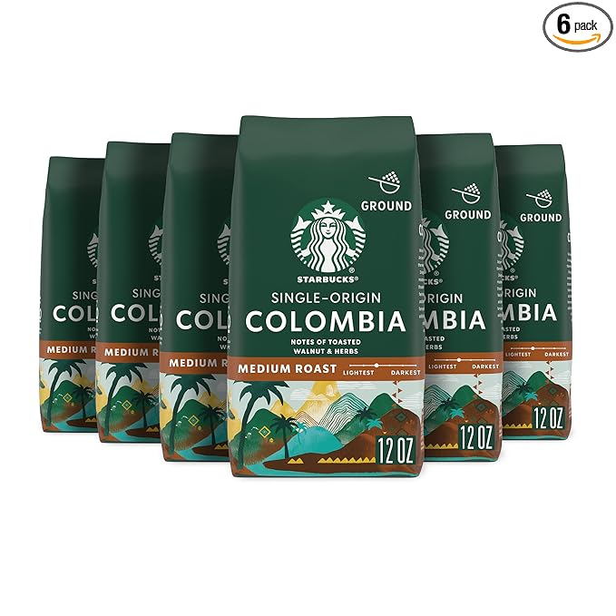 - PREMIUM GROUND COFFEE—Starbucks delivers exceptional coffee cup after cup with this 12-ounce bag of Colombia medium roast ground coffee—6 bags total